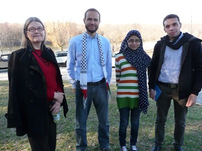 [Helena Cobban, Publisher, with Palestinian authors Refaat, Rawan and Yousef]