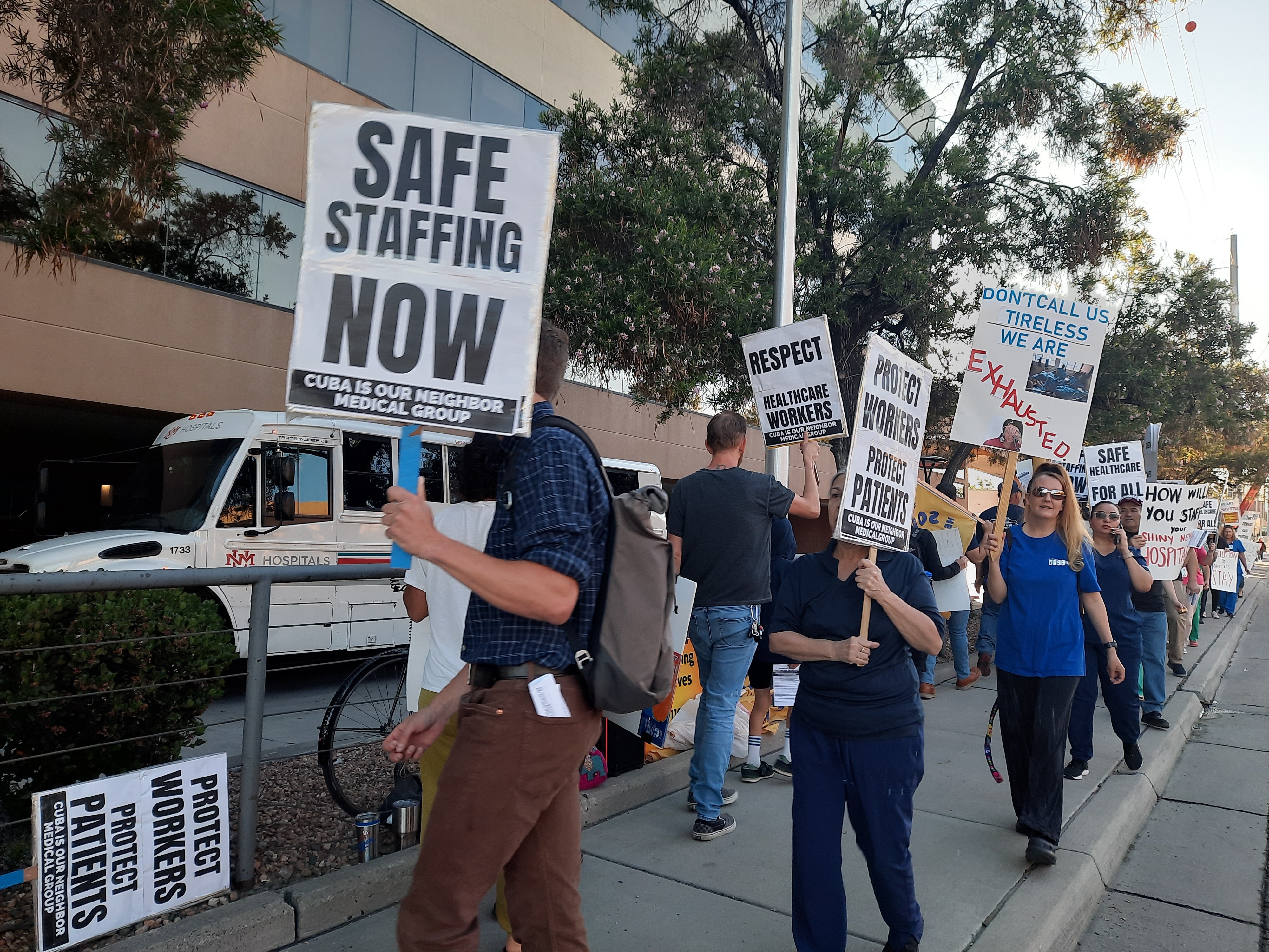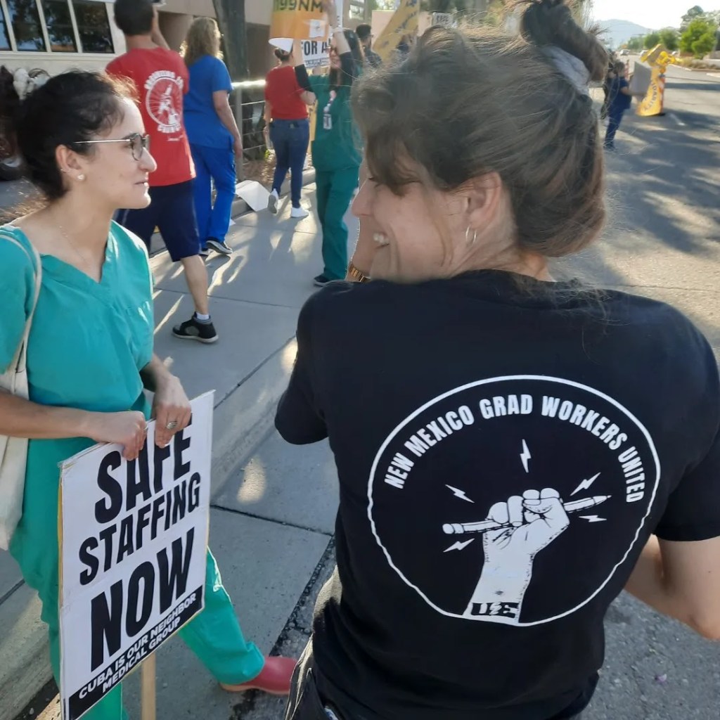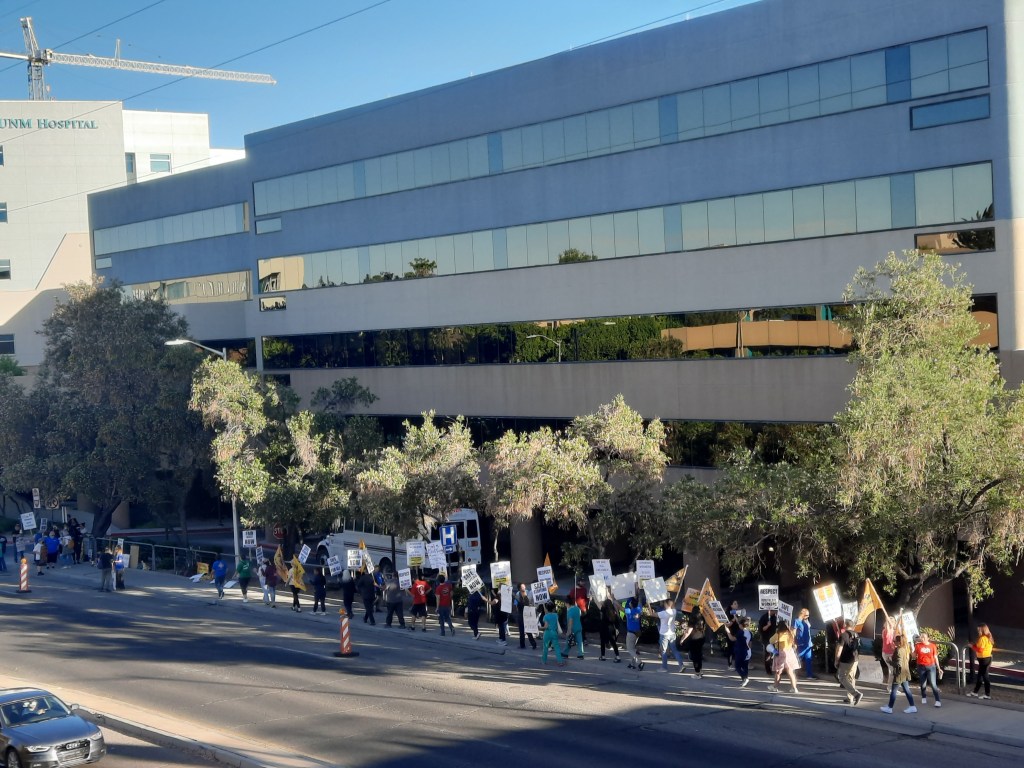 Bright and early on Thursday, June 22nd, healthcare workers and their allies marched in protest in front of UNM Hospital. Organized by District 1199nm, the union representing many hospital workers in New Mexico, they were joined by United Grad Workers of UNM and other unions and community members standing in solidarity with their demands.