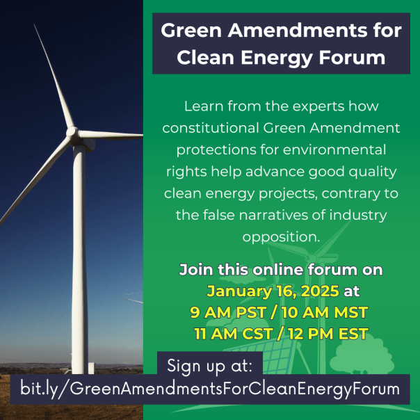 January 16, 2025 Green Amendments For The Generations will be holding a special forum to spell out exactly how Green Amendments are a powerful tool for supporting and advancing good quality clean energy projects and addressing the climate crisis.