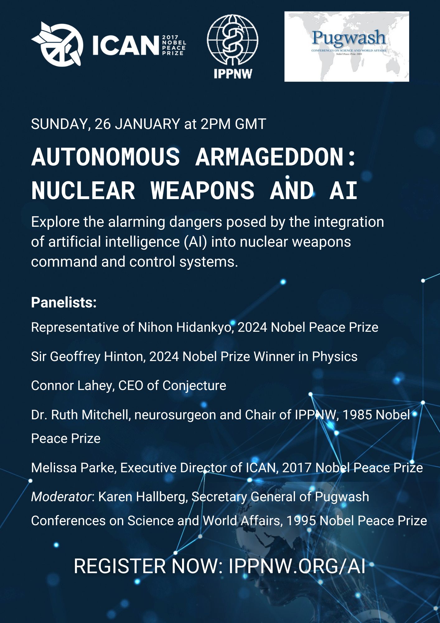 The four organizations which have won the Nobel Peace Prize for their work to abolish nuclear weapons invite you to join them for an important webinar Sunday January 26 at 2 PM GMT (9AM EST) on the danger that AI will be mated to nuclear command and control systems. Speakers for this event , Autonomous Armageddon, include Sir Geoffrey Hinton, widely recognized as the “godfather of AI” and the recipient of this year’s Nobel Prize in Physics, and a representative of Nihon Hidankyo the recipient of this year’s Nobel Peace Prize.